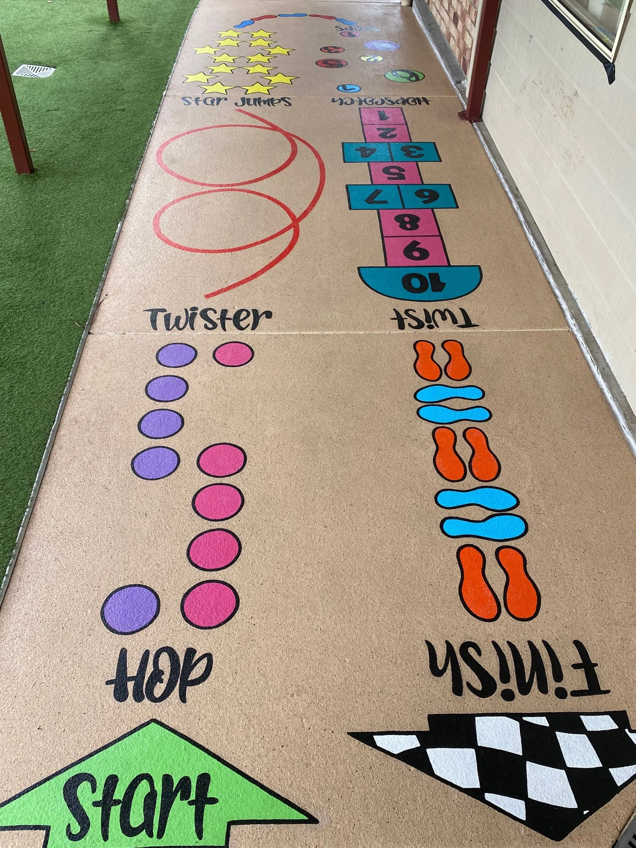 Hand painted kids exercise courses, pavement art by mural artist Matt Smidt in Rothwell Brisbane